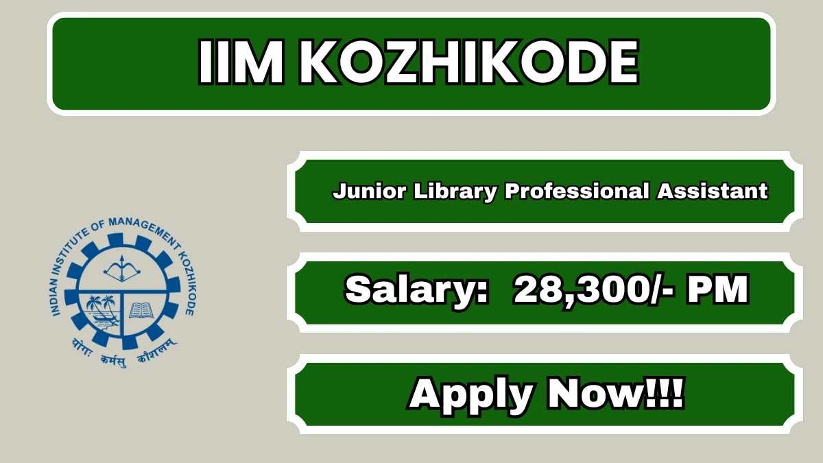 Junior Library Professional Assistant Recruitment 2026 – IIM Kozhikode | Apply Before 10 May 2026 Organization: Indian Institute of Management Kozhikode (IIM Kozhikode) Post Name: Junior Library Professional Assistant Total Vacancies: 3 Eligibility: Master of Library & Information Science (MLISc) with First Class Job Location: Kozhikode Base Salary: ₹(baseSalary) Postal Address: (streetAddress), (postalCode) Application Mode: … Read more